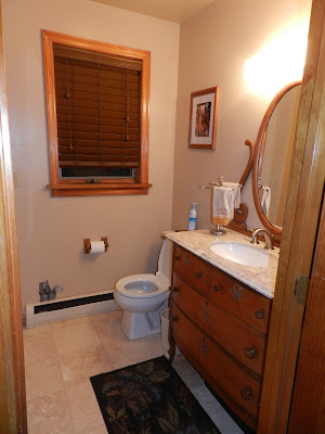 Aside from the floor, the biggest change in the bathroom was the vanity. We actually purchased one from Home Depot, made of dark "wood" (particle board!), with a nice marble top and set-in sink.